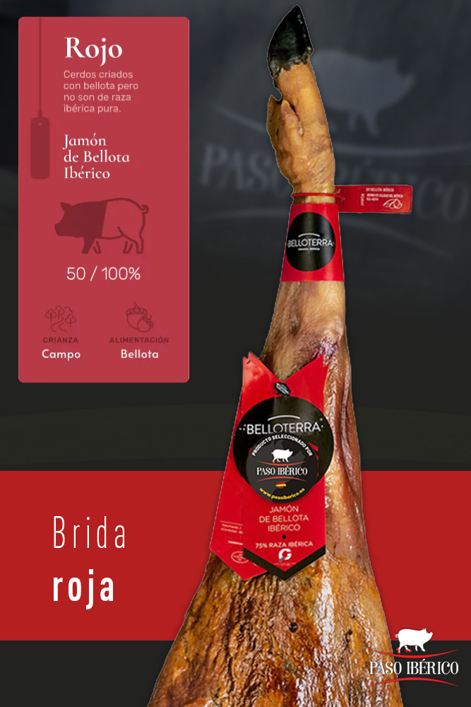 Los Jamones de Bellota 50% Raza Ibérica Brida Roja del Valle de los Pedroches seleccionados por Paso Ibérico, son procedentes de cerdos ibéricos criados en libertad en las dehesas del Valle de los Pedroches y alimentados en sus últimos meses a base exclusivamente de bellota (9-10 kg. diarios) y hierba. Cada pieza está numerada, lo cual asegura un perfecto seguimiento y control del proceso de curación, que nunca es inferior a 3 años.