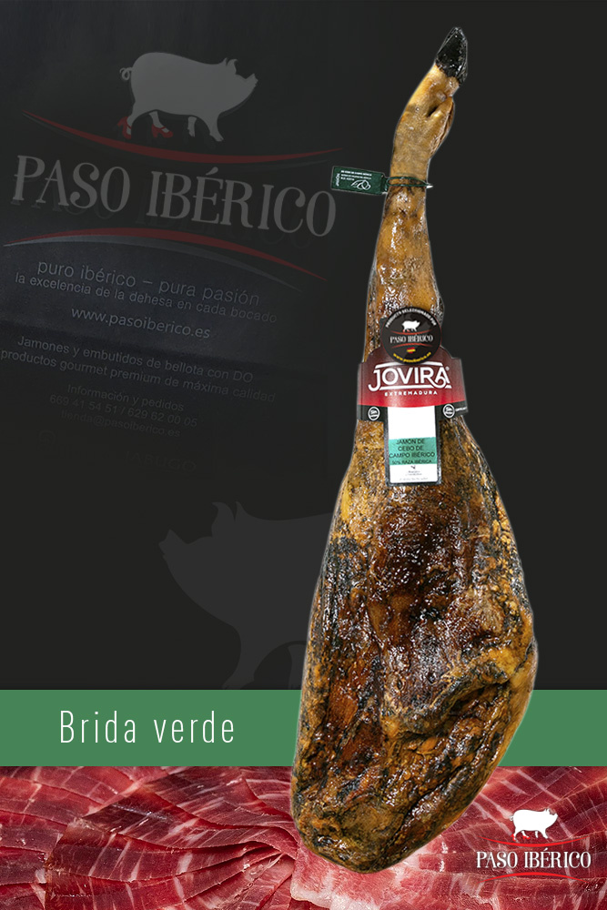 El Jamón Ibérico de Cebo de Campo 50% Raza Ibérica Brida Verde de Extremadura seleccionado por Paso Ibérico, es procedente de cerdos ibéricos criados en libertad en el campo extremeño y alimentados con cereales y piensos naturales de receta propia, lo que garantiza una carne de calidad infiltrada con grasa.