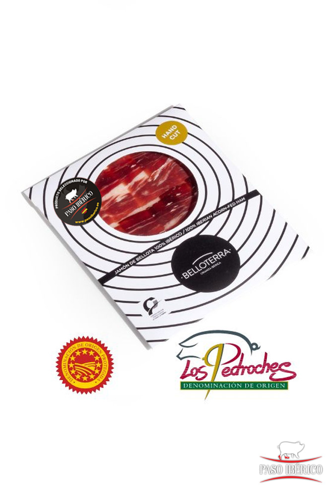 Se identifica Precinto y vitola de color negro con el logotipo del Consejo Regulador de la Denominación de Origen Protegida Los Pedroches junto a la categoría de Bellota 100% Ibérico.