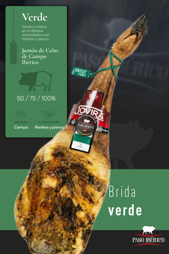 la Paleta Ibérica de Cebo de Campo 50% Raza Ibérica Brida Verde de Extremadura seleccionado por Paso Ibérico, es procedente de cerdos ibéricos criados en libertad en el campo extremeño y alimentados con cereales y piensos naturales de receta propia, lo que garantiza una carne de calidad infiltrada con grasa.
