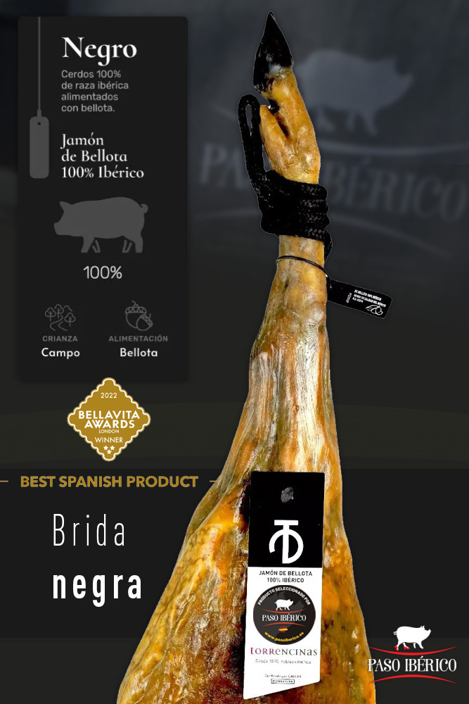 El Jamón Pata Negra de Bellota 100% Ibérico, Brida Negra, de Guijuelo, seleccionado por Paso Ibérico, es la denominación de calidad de cerdos de Raza Ibérica criados en libertad en las dehesas y alimentados en sus últimos meses a base exclusivamente de bellota (9-10 kg. diarios) y hierba.